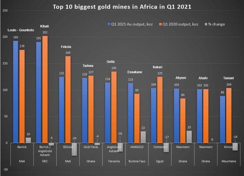 La liste complète des 10 plus grandes mines d’or d’Afrique au premier trimestre 2021 se trouve sur le graphique.