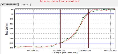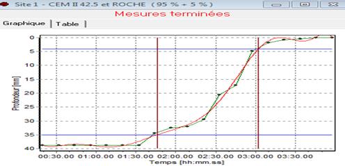 Fig. 35. Allure en histogramme d’indice de pouzzolanicité jusqu’au 28ème jour Fig. 36. Temps de début de prise et de fin prise du ciment 100%-Basalte 0% Fig. 37. Temps de début de prise et de fin prise du ciment 95%-Basalte 5%